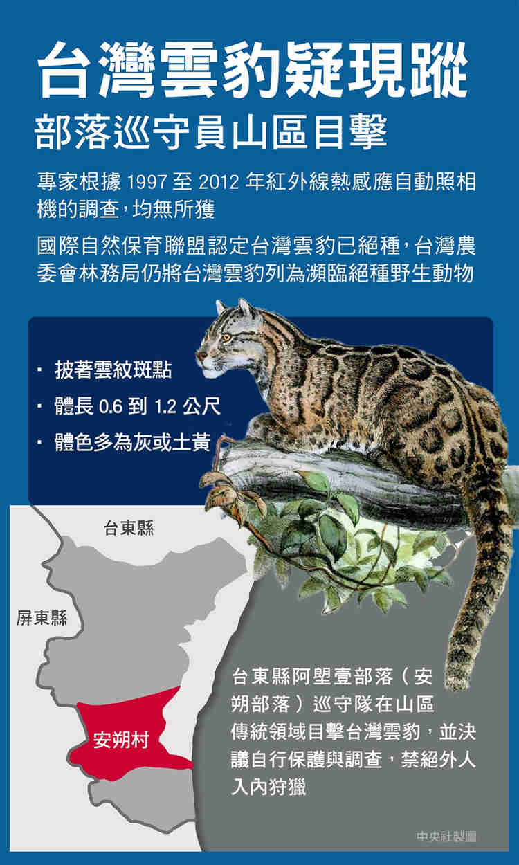 台灣雲豹是農委會公告「瀕臨絕種」野生動物。台東林管處說,台灣雲豹在近幾十年來沒有出現的跡象,這次能有如此具體的目擊描述,是需要加以重視,並積極確認。